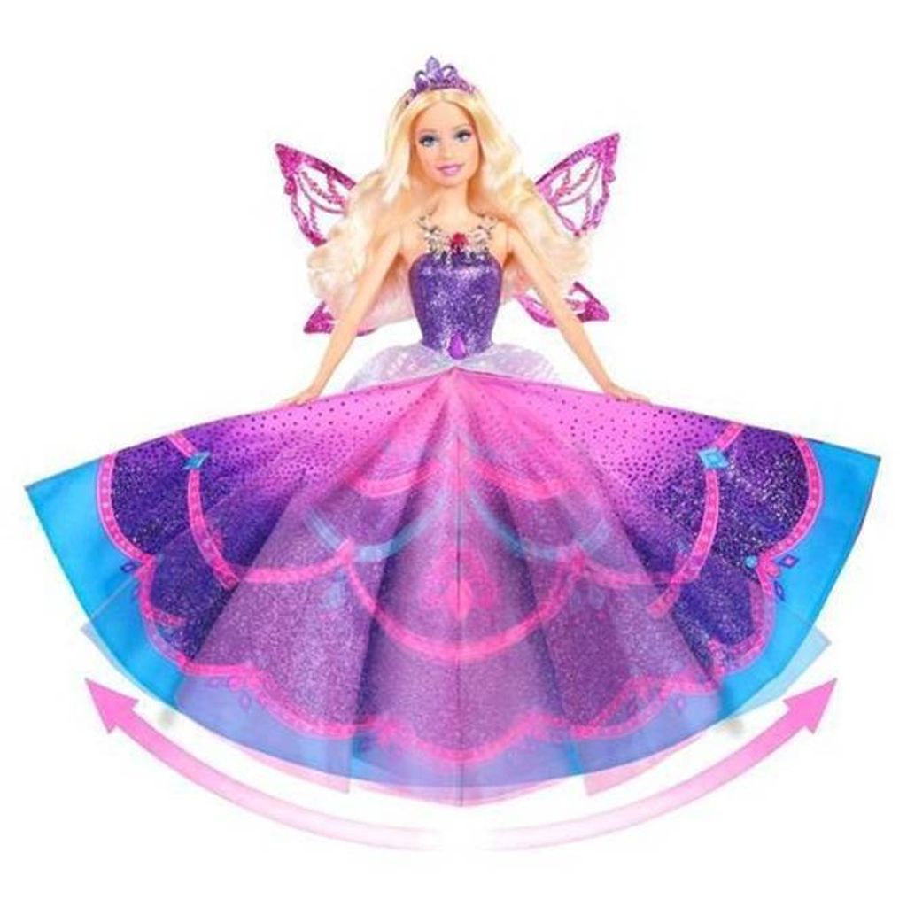 Barbie Mariposa and the Fairy Princess Catania Doll: The all new DVD, "Barbie Mariposa and the Fairy Princess" brings back the beloved fairy in a new role, as an ambassador to a faraway fairy kingdom, where she meets and befriends the local fairy princess. This doll captures the princess' story with a skirt and wings that transform from simply pretty to ballroom gorgeous. Girls just push a button to see her skirt pop open and her wings move up for her fantastical fairy princess look.